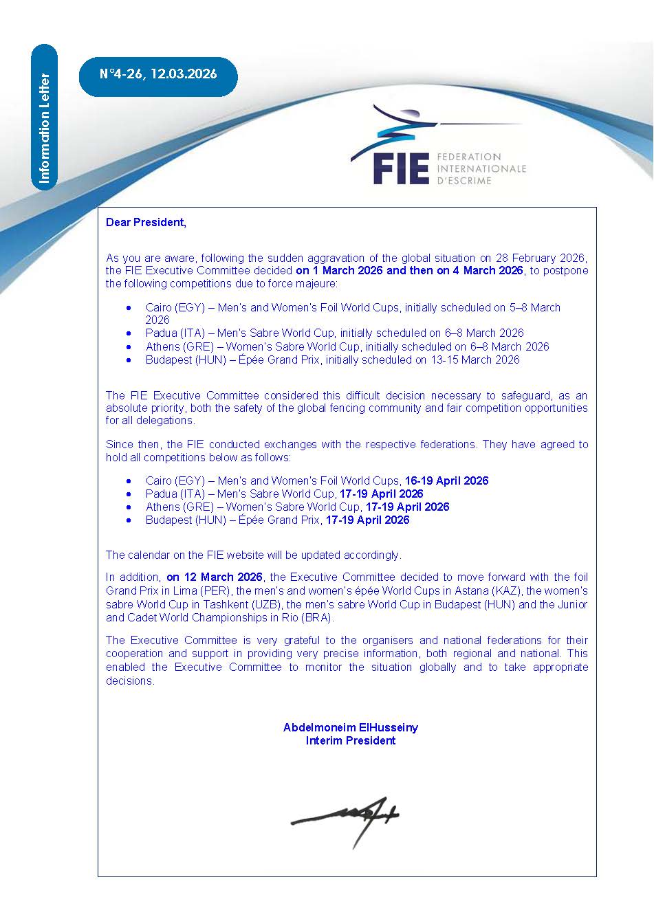 The International Fencing Federation (FIE) has announced the postponement and rescheduling of several World Cup and Grand Prix events originally scheduled for March 2026. Updated dates for these competitions have now been confirmed.